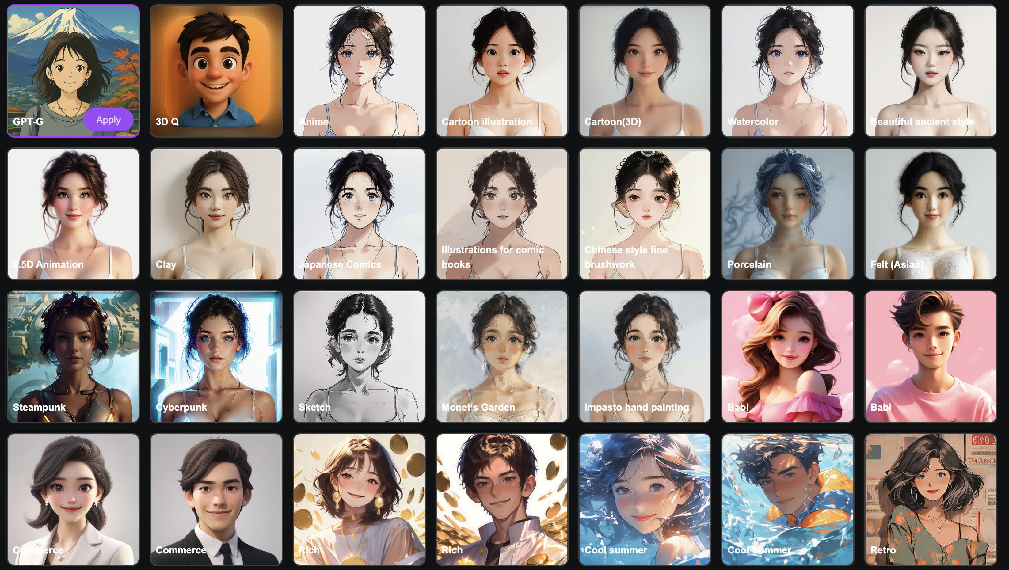 You can transform photo into various styles, including cartoon style, anime style, oil painting style, ghibli style, cyberpunk style, steampunk style, etc.
